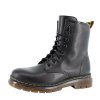 Высокие ботинки в стиле "DR. MARTENS" выполнены с 8 отверстиями для шнурков с каждой стороны, Модель изготовлена на темной подошве с декоративным рантом в виде желтой сорочки. Ботинки из натуральной кожи в 3 базовых цветах. Для удобства надевания предусмотрена застежка-молния. Подкладка обуви байка. Съемная стелька.